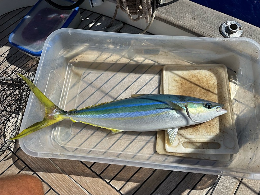 Das Sahnehäubchen: Angelglück. Wiederum schlagen beide Ruten gleichzeitig an, wir sind offenbar durch einen Fischschwarm gesegelt. Ein Fisch geht uns vom Haken, aber direkt darauf schlägt die gleiche Rute wieder an während ich jetzt mit der anderen Angel beschäftigt bin. Interessanterweise scheint es ein gemischter Schwarm zu sein. Zunächst holen wir einen Rainbow-Runner an Bord …