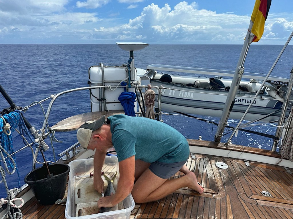 Und am nassen Deck kann man erkennen, dass während des Filetierens ein Schauer einsetzt. das lässt sich aber bei diesen Temperaturen gut verkraften.