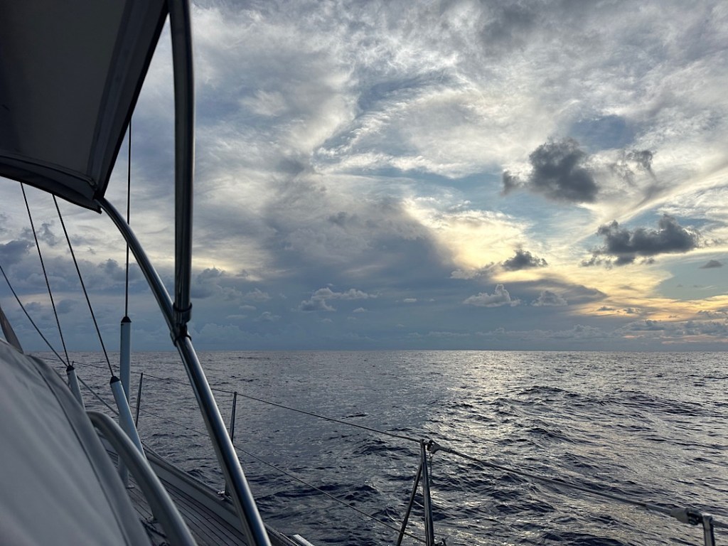 Das Schöne daran: die Vorhersage der Meteorologen tritt ein, das Band löst sich bei unserer Annäherung ganz langsam vor uns auf, die Reste ziehen ab. Sehr schön. Was bleibt, sind natürlich einige Schauer, Winddreher und auch ein bisschen Kabbelsee, vor allem in der Nacht. Und heute können wir entgegen der Erwartung eines ausgeprägten Schwachwindgebietes wiederum (jedenfalls bisher) auch immer wieder längere Abschnitte segeln, bei babyblauem Himmel vor uns und tiefblauem Ozean (und einer dunkelgrauen Wolke hinter uns).