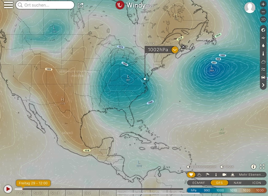 Wir gehen mit Elisa die verschiedenen Vorhersagen auf Windy.com durch. Weit im Süden schiebt sich ein kräftiges Tiefdrucksystem heran.