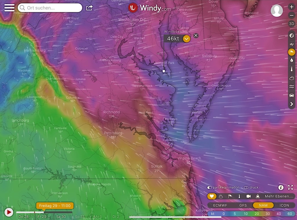 Zurück an Bord genießen wir noch ein wenig die Ruhe vor dem angesagten Sturm. Die Wettermodelle sind sich nicht ganz einig, bis zu 10 Bft könnten es nach dem NAM-Modell in der Chesapeake werden, hier für Solomon’s sagen immerhin drei von vier Modellen um die 40 kn und darüber (8 bis 9 Bft) voraus, lediglich das sonst in den Böen oft genauere ECMWF beschränkt sich diesmal auf 34 kn.
