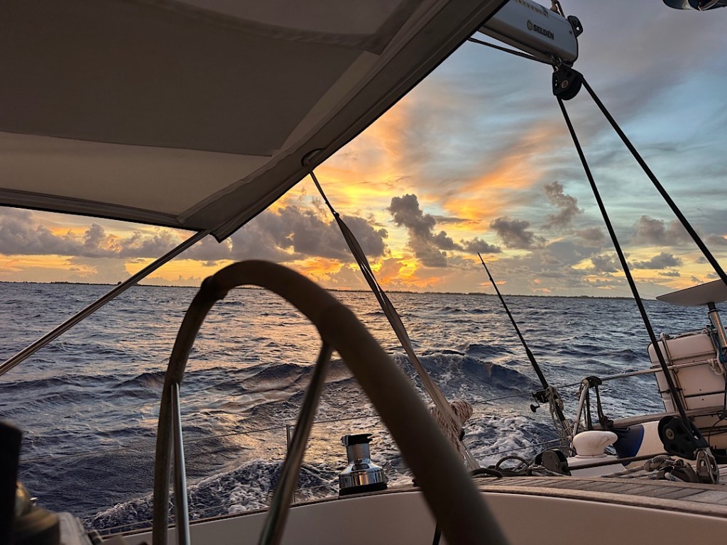 Immerhin: wir sehen zwar Wetterleuchten am Horizont, aber ein Gewitter erwischt uns nicht. Auch von Squalls werden wir weitgehend verschont. Nur einmal erwischt uns solch eine turbulente Wolke. Ziemlich genau zu Sonnenuntergang.