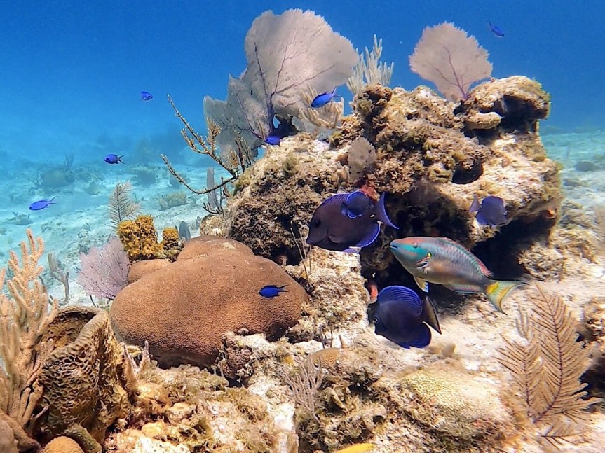 Nur eine Meile weiter das nächste Blue Hole, der nächste Ankerstop. Dieses Sinkloch ist kleiner im Durchmesser und auch nur rund 20 m tief, wir können beim Schnorcheln durchgängig den Grund erkennen. Das Blau leuchtet etwas heller, dafür ist aber der gesamte Rand fast durchgängig mit schönen Korallen bewachsen und es gibt entsprechend viele bunte Rifffische und auch Schwarmfisch zu bewundern. Auch hier wieder ganz herrliches Schnorcheln.