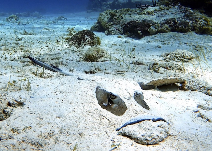 Einige Fischer nutzen die Bucht offenbar, um ihren Fang zu sortieren und zu putzen, es gibt also vermehrt Haie. So auch, als wir das nahe liegende dritte Blue Hole vor Water Cay mit dem Dinghy besuchen, bis auf die erstaunlich vielen Haie ist es eher unspektakulär und lädt nicht zum längeren Schnorcheln ein, nur eine kurze Runde um das Loch gemeinsam mit Ingo, wobei wir einen der Haie offenbar so erschrecken, dass er den Schnellgang einschaltet und hakenschlagend die Flucht ergreift.